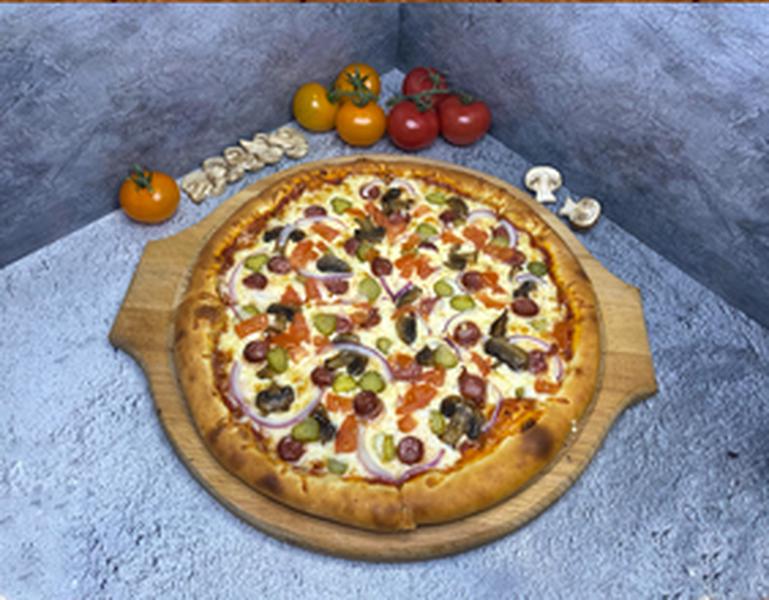 Состав: Пицца на нежнейшем фирменном тесте, с томатным соусом, сосисками, маринованными огурчиками, свежими шампиньонами, томатами, красным лучком и сыром моцарелла. Украшена свежим укропом.
