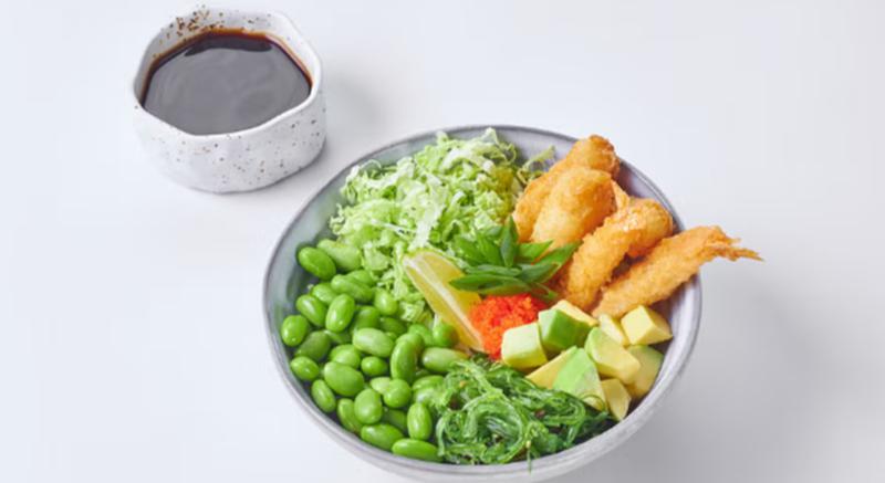 Состав: Креветка, бобы эдамаме, авокадо, пекинская капуста, водоросли чука, оранжевая икра масаго, зеленый лук, ореховый соус, поке соус, лайм, рис