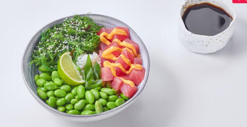 Состав: Тунец, бобы эдамаме, водоросли чука, зеленый лук, кунжут, ореховый соус, спайси соус, поке соус, лайм, рис
