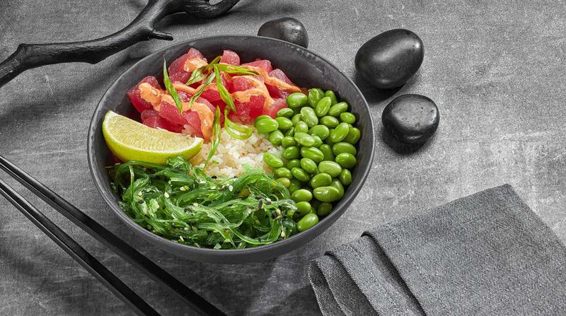 Состав: Филе тунца, бобы эдамаме, чука, рис, соус ореховый, соус азиатский, соус спайси, лук зеленый, кунжут, лайм.