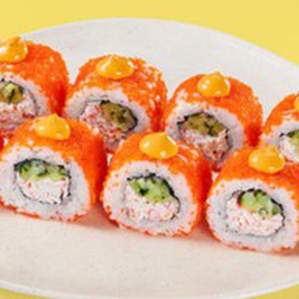 Состав: Крабовые палочки, икра масаго оранжевая, спайси соус, рис, нори. *Не забудьте заказать имбирь, васаби и соевый соус. Они не входят в стоимость заказа.