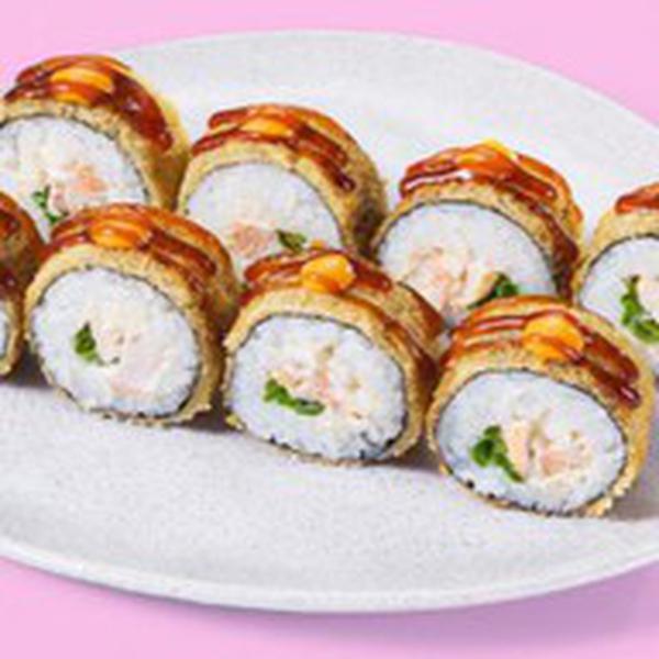 Состав: Курица, зеленый лук, монако с беконом, темпурный кляр, панировочные сухари, унаги соус, спайси соус, рис, нори. *Не забудьте заказать имбирь, васаби и соевый соус. Они не входят в стоимость заказа.