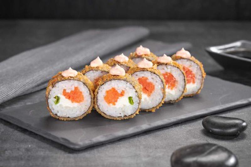 Состав: Лосось, рис, сливочный сыр, соус розовый, лук зеленый, кляр (мука, вода), сухари панко, водоросли нори.
