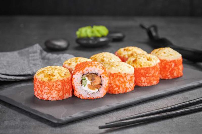 Состав: Лосось терияки, рис, сливочный сыр, свежий огурец, соус нежный (сыр моцарелла, майонез, чеснок), икра масаго, водоросли нори.
