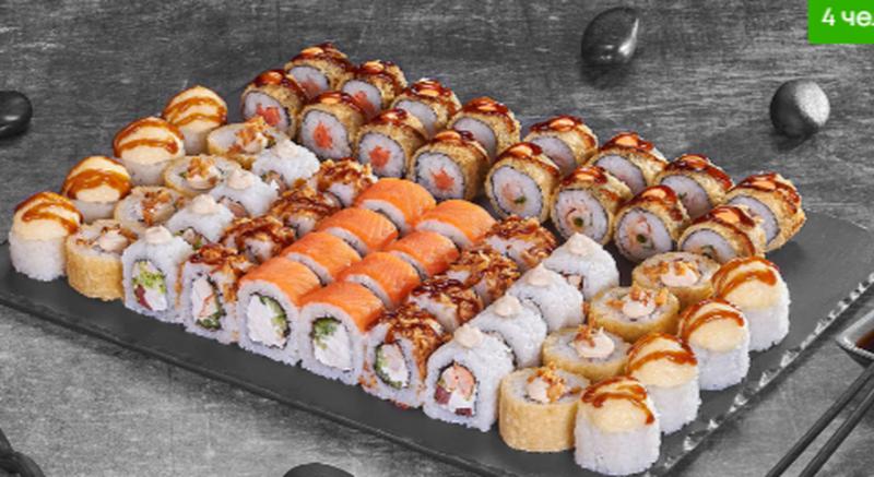 Состав: Филадельфия лайт сяке (8 шт.), Куритос (8 шт.), Чикен Дон (8 шт.), Мистер крабс запеченный (8 шт.), Чикен темпура (8 шт.), Сяке лайт темпура (8 шт.), Бекон Лайт темпура (8 шт.)