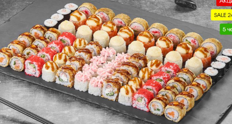Состав: Калифорния каппа маки с икрой (8 шт.), Лава с крабом (8 шт.), Дон бекон (8 шт.), Маки эби (8 шт.), Сяке лайт темпура (8 шт.), Бекон лайт темпура (8 шт.), Нежный с лососем запеченный (8 шт.), Калифорния темпура (8 шт.), Цезарь ролл запеченный (8 шт.), Чикен спайси запеченный (8 шт.)