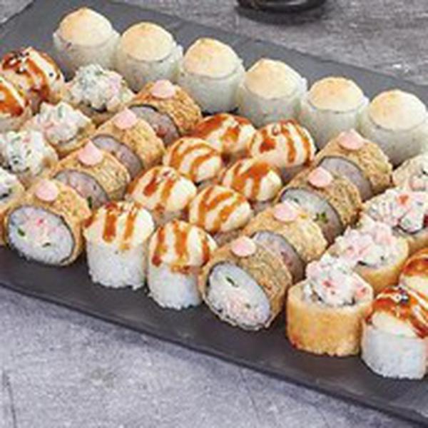 Состав: Оливье темпура (8 шт.), Краб фри темпура (8 шт.), Пылкая креветка (8 шт.), Мистер Крабс (8 шт.), Цезарь ролл (8 шт.)