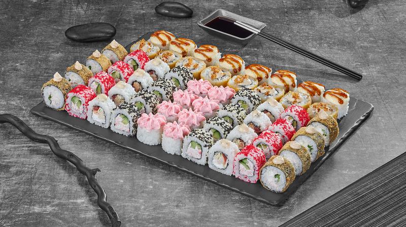 Состав: Ролл Калифорния классика (8 шт), Ролл Калифорния в кунжуте (8 шт), Ролл Лава с крабом (8 шт), Ролл Куритос (8 шт), Ролл Чикен темпура (8 шт), Ролл Крабстер темпура (8 шт), Ролл Нежный с лососем запеченный (8 шт) *Внешний вид блюда может отличаться от фото на сайте