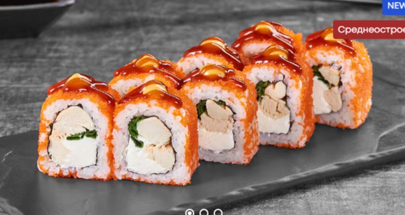 Состав: Курица, сливочный сыр, зеленый лук, оранжевая икра масаго, унаги соус, спайси соус, рис, нори