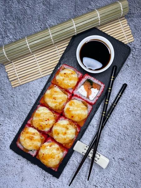 Состав: Ролл в икре масаго, со сливочным сыром, лососем, зеленым луком, под фирменной сырной шапкой с соусом сладкий чили
