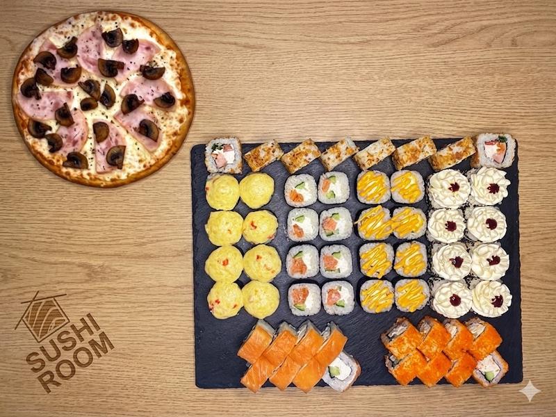Состав: Филадельфия лайт, Калифорния, Чикен, Чиз, Наоми, Гейша, Тори хот + пицца Ветчина и грибы.