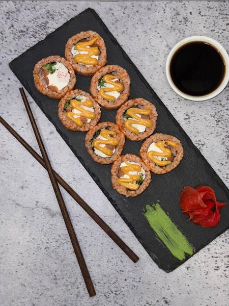 Состав: Ролл с лососем, мясом "Снежного краба", сливочным сыром и зеленым луком, икрой "Масаго" внутри, украшен соусом "Спайси"