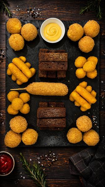 Состав: -Корн-Дог Чиз -Палочки из сыра "Моцарелла" -Сырные шарики с ветчиной -Шарики из сыра "Моцарелла" -Сырные шарики с крабом -Чесночные гренки