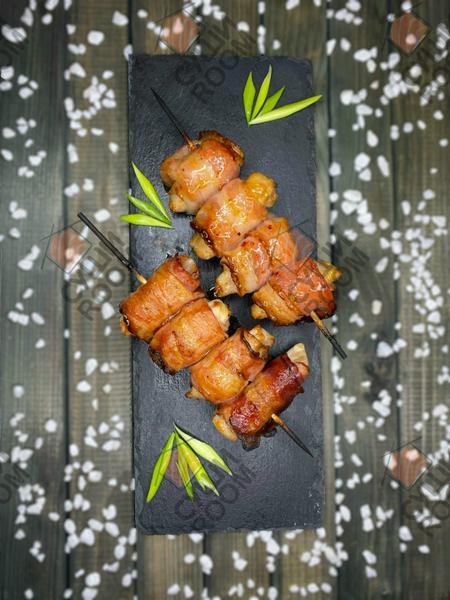 Состав: Блюдо из кусочков курицы, обернутых в беконе, поджаренных на бамбуковых шампурах. Подаются под соусом "Сладкий Чили".